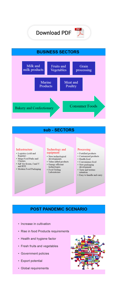 The recent pandemic has open up new avenues for food business sectors. In current situation everyone has understood importance of health and hygiene. Requirements of quality and nutritious products has raised drastically. Market requirement has been shifted to processed, packed and nutritionally formulated products. Considering overall situation and condition government is providing guidance and support through subsidies and schemes. Many institutes and organizations are involved in boosting the industry.